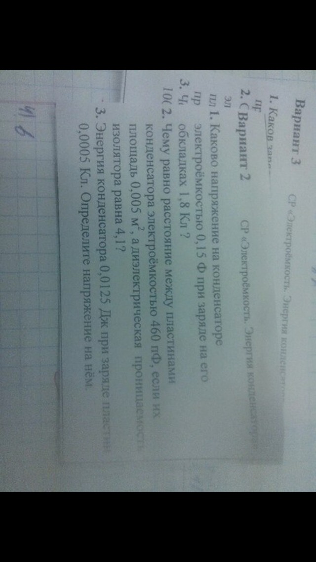 2. С = e*e0*S/d, d = e*e0*S/C = 4.1*8.85E-12*0.005/460E-12 = 3.9E-4 метра = 0,39 мм