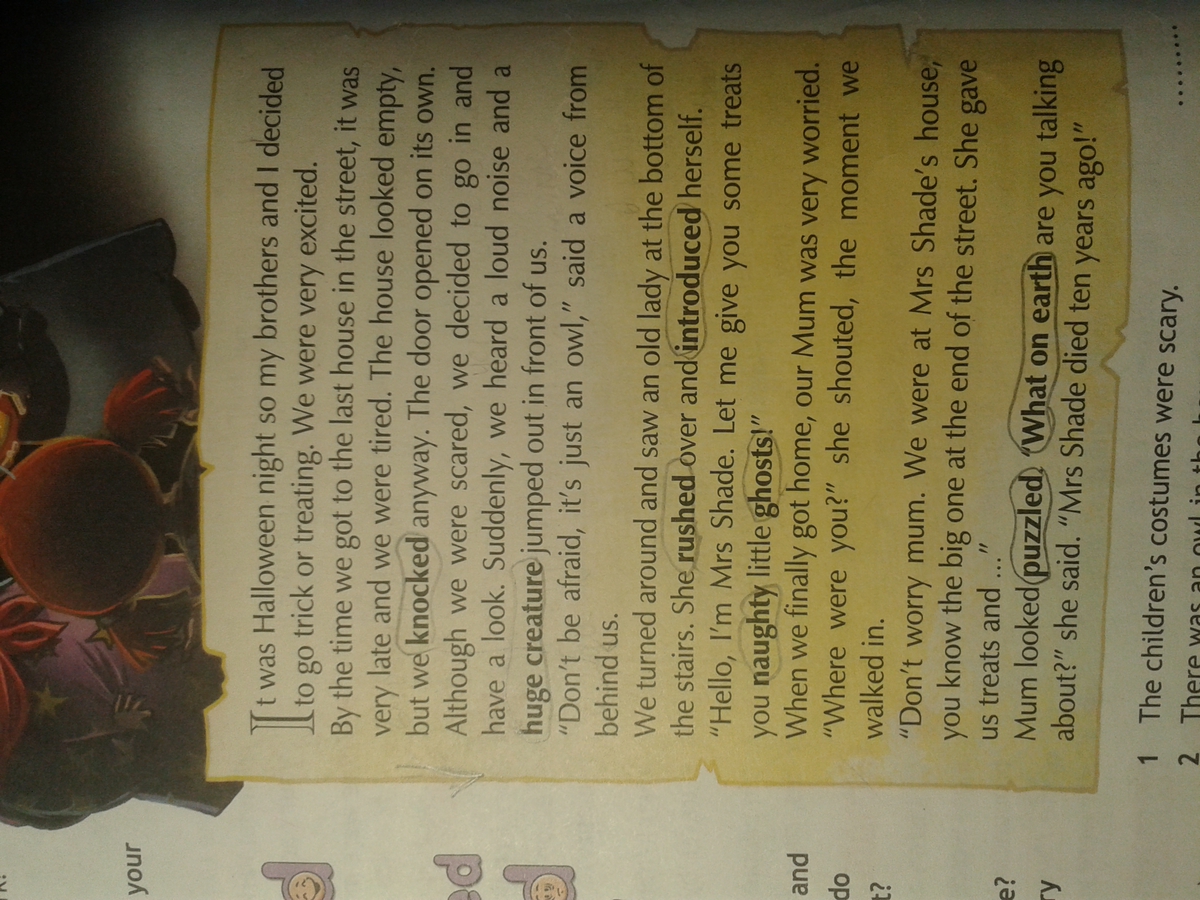 К тому времени как мы добрались до последнего дома на улице, было уже очень поздно и мы устали.Дом выглядел пустым, но мы knoked в любом случае. Дверь открылась сама.Хотя мы боялись, мы решили пойти и посмотреть. Вдруг,мы услышали громкий шум и огромная gnbwf выскочила перед нами.