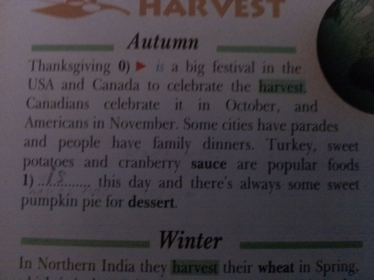 Фенксгивинг.0) из э биг фэстивл ин де Ю ЭС ЭЙ(USA) энд Кэнэдэ ту силебреит де хавэст. Кэнадиэнс силебреит ит ин Октоубе, энд Эмериканс ин Навэмбэ. Сам ситиз хэв парадис энд пипл хэв фэмэли динэс. Тёкэй, патэйтэс энд крэнбори сэус а попьюлэ фудс. 1) из дис дэй энд вериз олвэйс сам свит памкин паэ фо дисет.