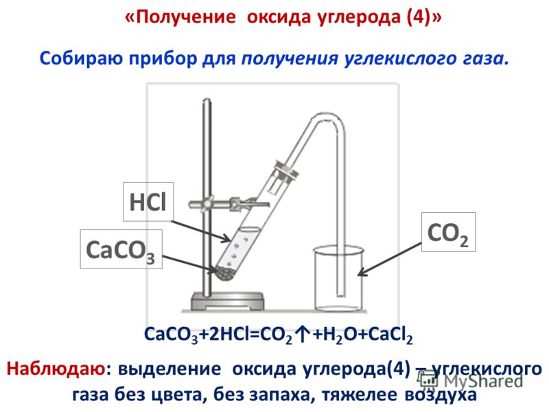 1.В пробирку поместить немного карбоната кальция и прилить 2-3 мл раствора соляной кислоты.Закрыть пробирку газоотводной трубкой.Собрать полученный газ в колбу.Поднести зажженную лучинку и убедиться в наличии углекислого газа.Записать уравнение реакции и полученные наблюдения .Сделать рисунок собранного прибора.