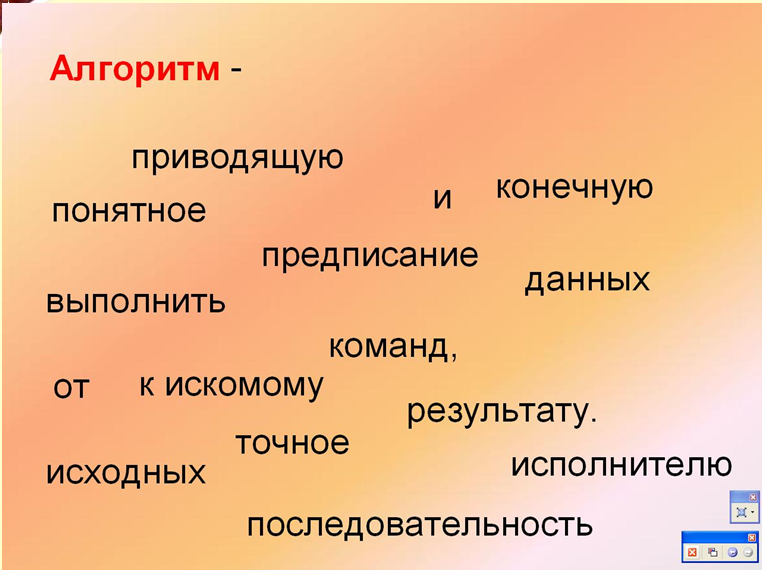 Алгори́тм — набор инструкций, описывающих порядок действий исполнителя для достижения результата решения задачи за конечное число действий. В старой трактовке вместо слова «порядок» использовалось слово «последовательность», но по мере развития параллельности в работе компьютеров слово «последовательность» стали заменять более общим словом «порядок».