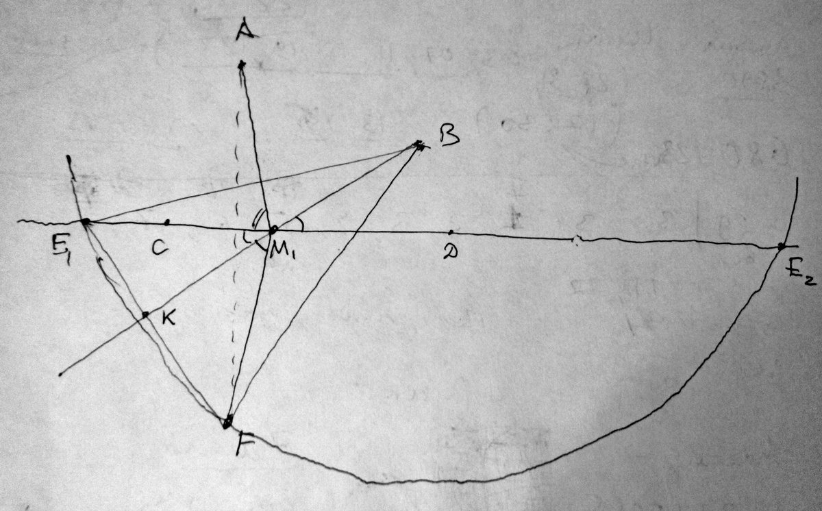 2) Проведем окружность с центром B и радиусом BF до пересеченеия с прямой CD в точках E1 и E2, причем пусть E1 ближе к А, чем E2.