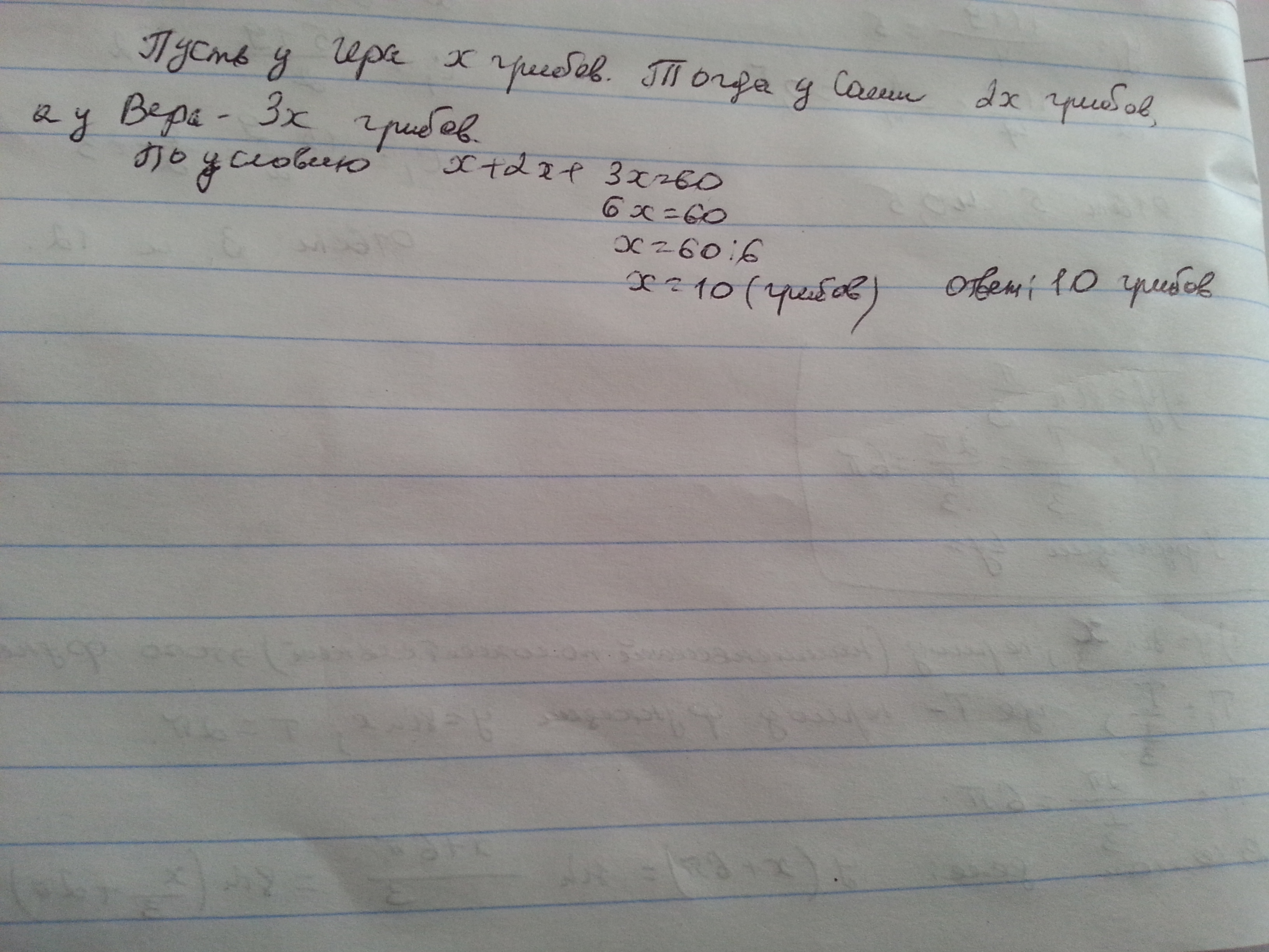 Пусть x грибов нашла Ира, тогда Саша нашёл - (2x) грибов, а Вера - (3x) грибов. Всего дети нашли 60 грибов.