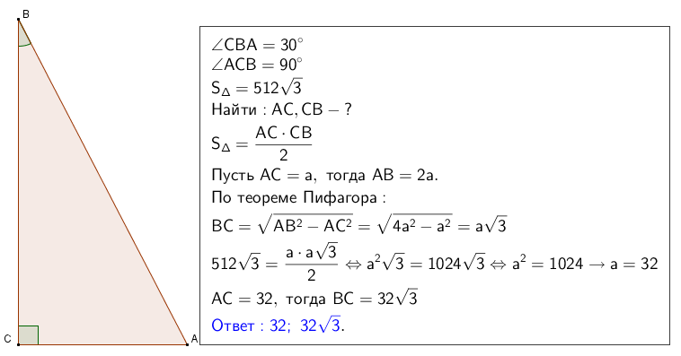 Дан прямоугольный треугольник АВС, один из углов =30 градусам,площадь=512 корней из 3 .Найти катеты