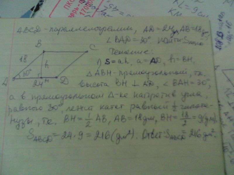 S=ab sin30*= 216 (дм2)........