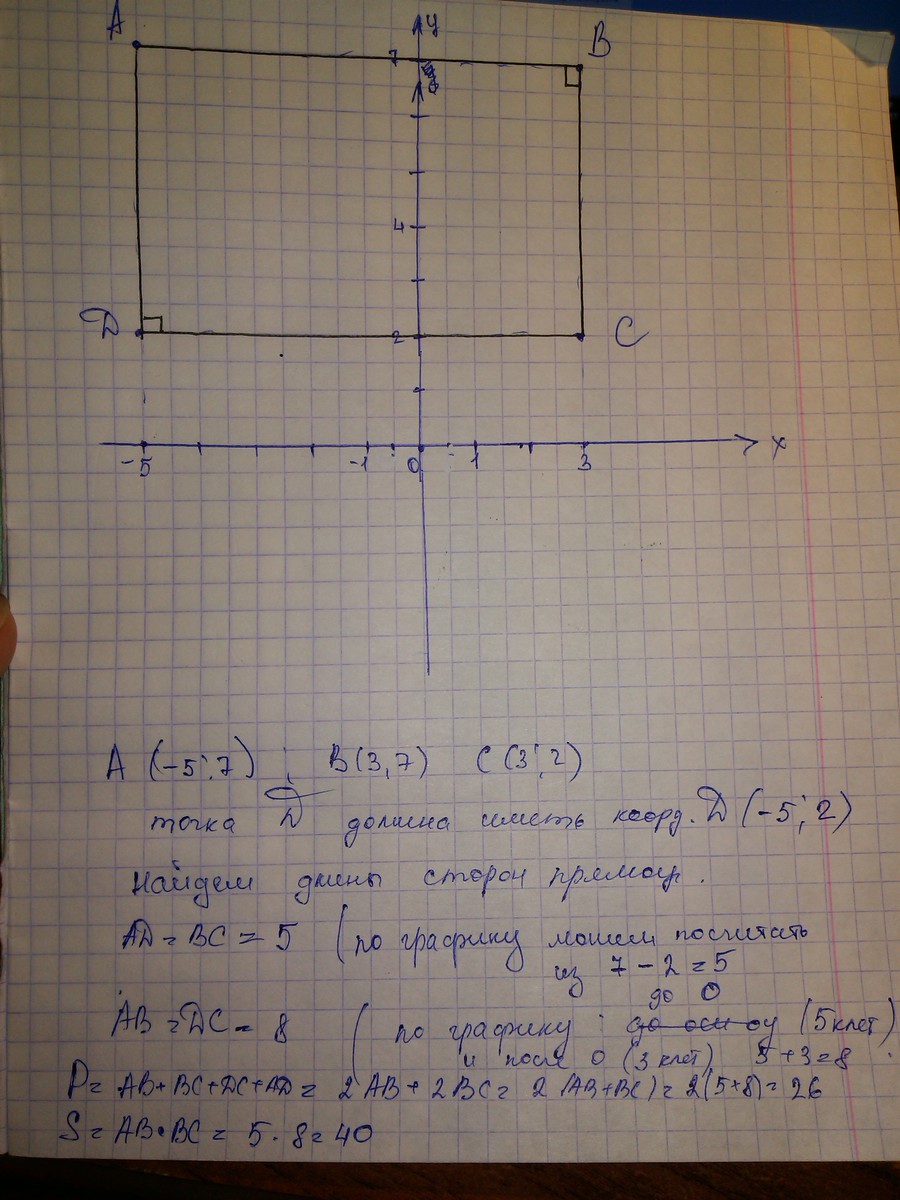 Если точка D будет иметь координаты (-5;2) получится прямоугольник. Находим периметр: а=8, в=5. Р=(а+в)х2 Р=(8+5)х2=13х2=26см. Находим площадь: S=а х в S=8х5=40кв.см