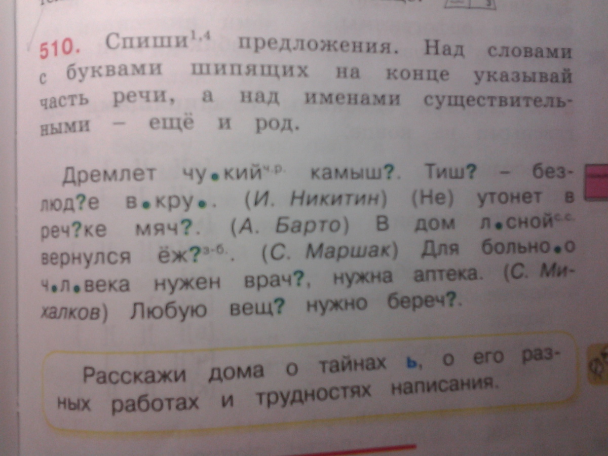 Дремлет чуткий камыш.(м.р, поэтому мягкий знак не ставится). Тишь (ж.р)- без людей вокруг. Не утонет в речке(чк/чн без мягкого знака) мяч(м.р). В дом лесной вернулся ёж(м.р.) Для больного человека нужен врач(м.р), нужна аптека. Любую вещь(ж.р) нужно беречь.