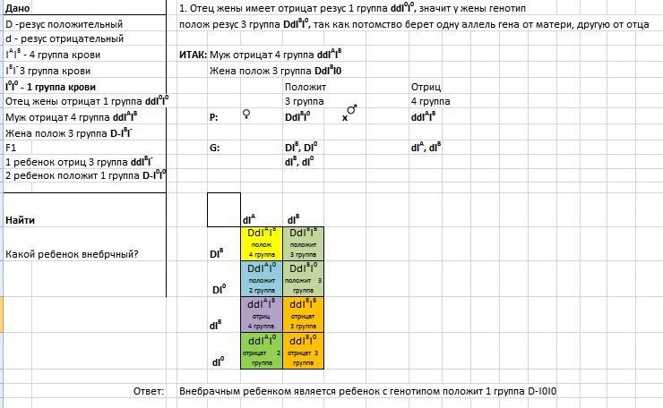 мужчина,имеющий резус отрицательный,кровь 4 группы женился на женщине кровь положительная 3 группы,отец жены имел резус отрицательный 1 группы.В семье имеется два ребенка: один ребенок резус отрицательный 3 группа,второй ребенок резус положительный 1 группы.Какой ребенок внебрачный. Таблица пенетти