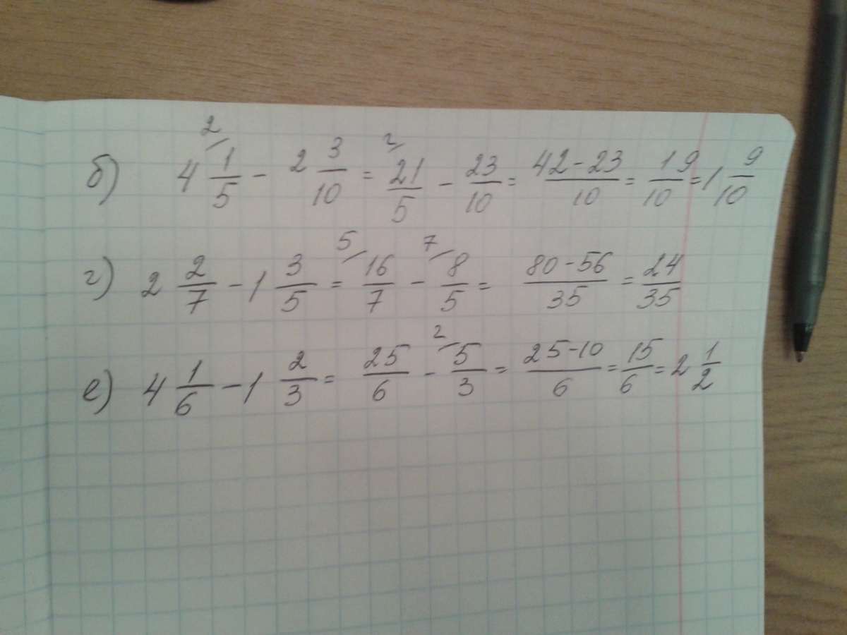 Вычислите разность, воспользовавшись любым из известных вам способов б) 4 1/5 - 2 3/10; г) 2 2/7 - 1 3/5; е) 4 1/6 - 1 2/3. ПОМОГИТЕ ПОЖАЛУЙСТА!!! Ну