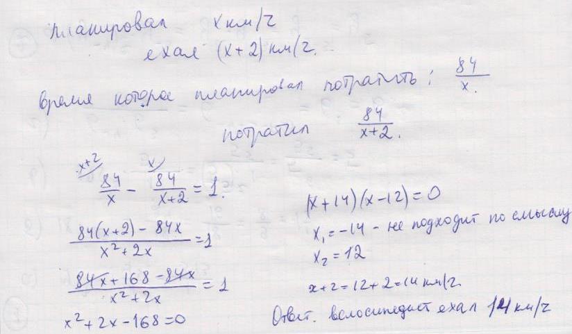 Путь= 84 км. Велосипедист проехал это расстояние на 1 час быстрее чем нужно, проезжая каждый час на 2 км больше чем планировал. С какой скорость ехал велосипедист?