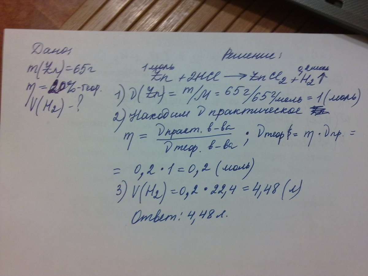 Для получение водорода в лаборатории используется следующая реакция: Zn + 2HCl -> ZnCl2 + H2 ↑ Определите объём водорода, который получится из 65 г Zn, если выход продуктов реакции 20%