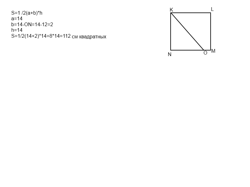 KLMN - квадрат со стороной 14 см. На стороне MN взята точка О, так что ON = 12 см. Найдите площадь трапеции KLMO