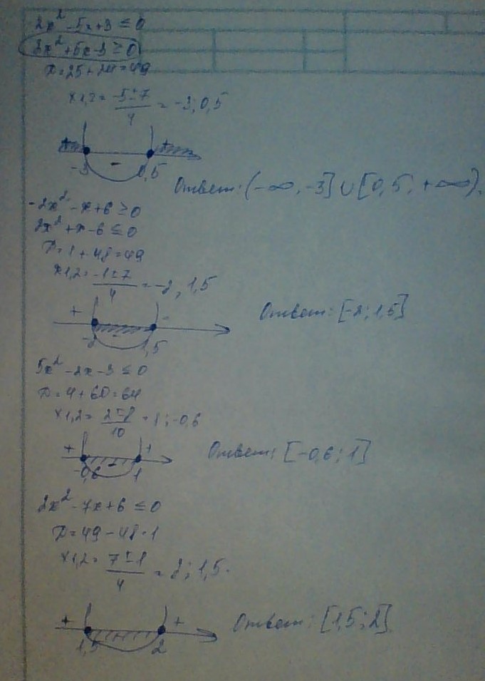 Решите неравенство: -2х2-5х+3 меньше рано 0; -2х2-х+6 больше равно 0; 5х2-2х-3 меньше равно 0; 2х2-7х+6 меньше равно 0. Помогите пожалуйста!!!!!