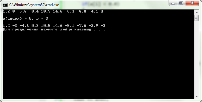 double a[10] = { 1.2, 0.0, -5.8, -0.4, 10.5, 14.6, -6.3, -8.8, -4.1, 0.0 };