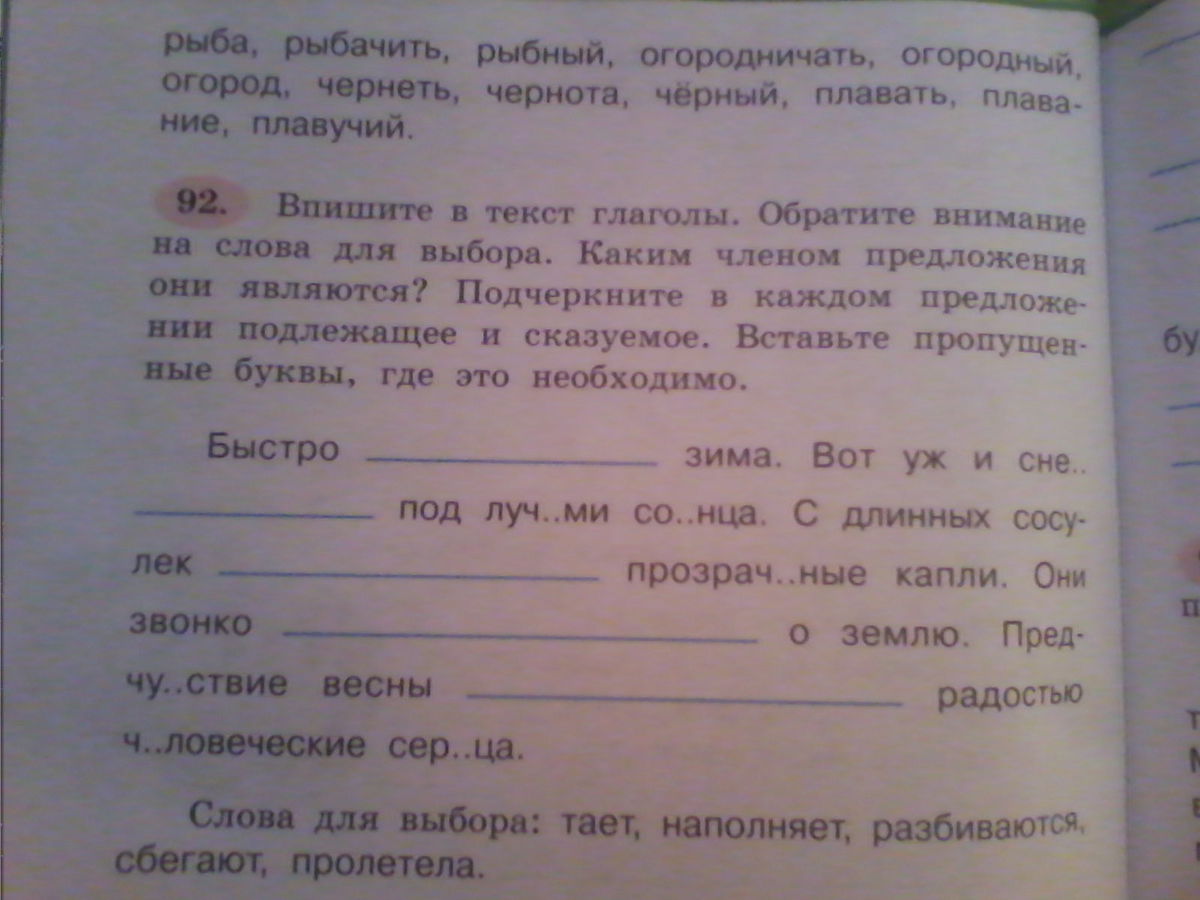 91 бегать зеленеть удлинить белить рыбачить огородничать чернеть плавать. 92 Быстро кончается зима. Вот уж и снег тает под лучами солнца. С длинных сосулек капают прозрачные капли. Они звонко падают о землю . Предчувствие весны наполняет радостью человеческие сердца