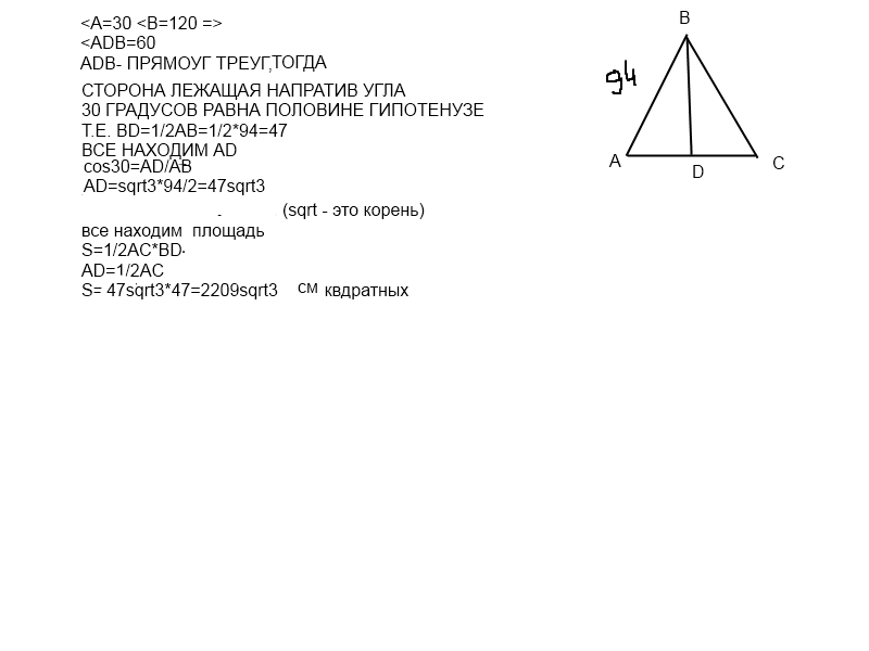 В равнобедренном треугольнике боковая сторона равна 94 , а угол лежащий напротив основания, равен 120 градусам. Найдите площадь треугольника. Помогите пожалуйста!!!