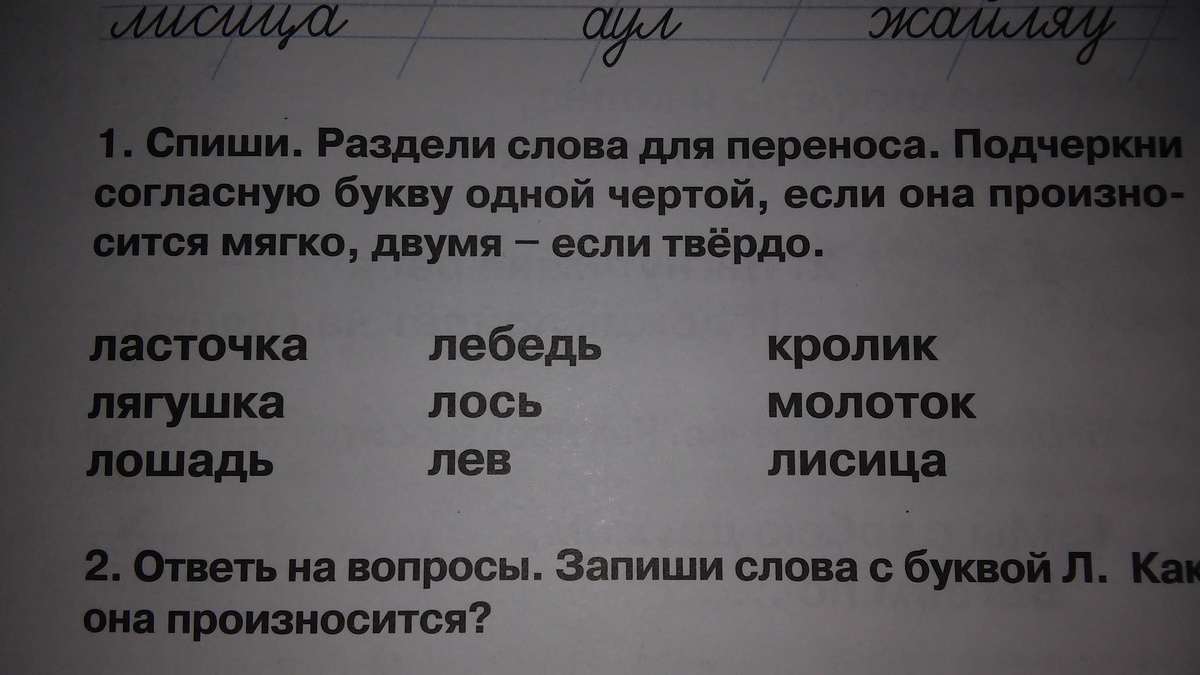 спиши. Раздели слова для переноса. Подчеркни согласную букву одной чертой, если она произносится мягко, двумя-если твёрдо.