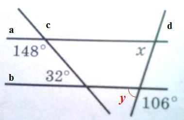 С другой стороны, для пересекающийся прямых b и d угол y является смежным с углом, значение которого равен 106°. Но сумма смежных углов равен 180° и поэтому