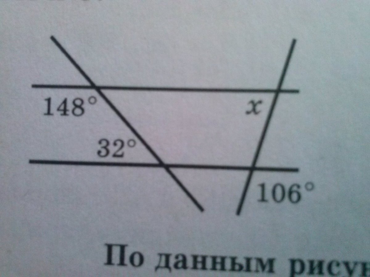 Из рисунка видно (см. рисунок), что секущая прямая c пересекает прямые a и b. При этом пара односторонних углов имеют величины 148° и 32°. Сумма этих односторонних углов равна 148°+32°=180°. Применим следующее свойство: