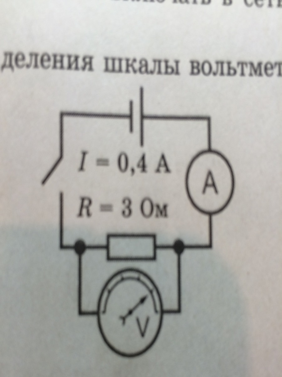 У вольтметра цена деления 0,3В ( U=I*R=0,4A*3Ом=1,2В и это на 4 деления, значит на 1 деление 0, 3 В)