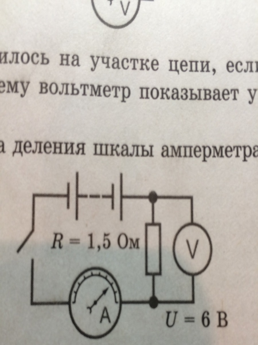 У амперметра цена деления 1,75 А (I=U/R =6/1.5=4А и это на 7 делений, значит на одно деление 7/4=1,75 А)