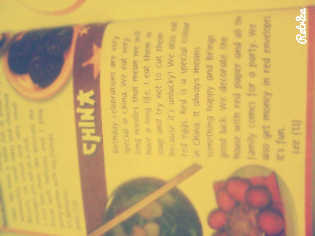 День рождение отмечают очень особенно в Китае. Мы едим длинную лапшу это означает что мы долго будим жить. Я км их в супе и стараюсь не резать их потому что это к не удаче. Мы еще кушаем красные яйца. Красный это особенный цвет в Китае. Он всегда означает счастье и приносит удачу. Мы украшаем дома из красной бумаги и вся семья приходит на праздник. Мы еще даем деньги в красном конверте. Это весело.