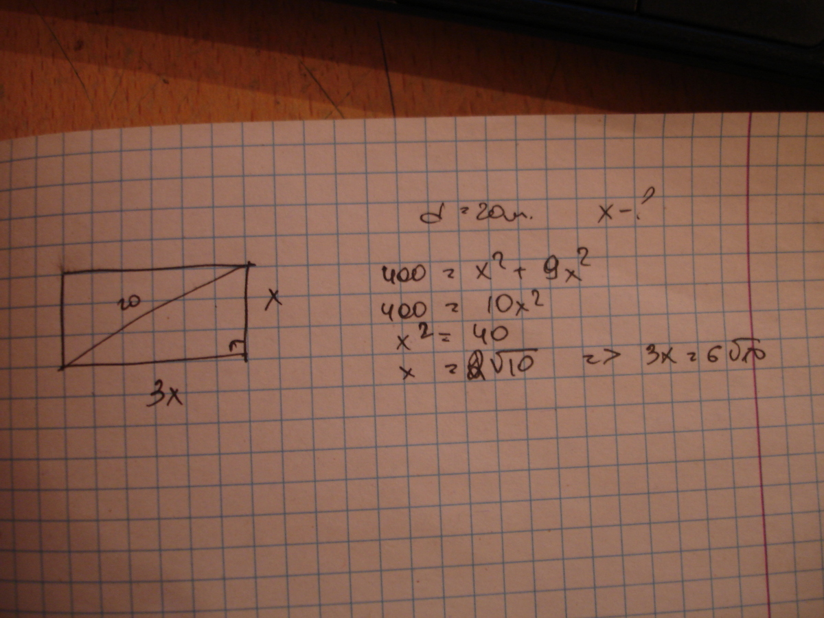 найдите стороны прямоугольника, если одна из них в 3 раза меньше другой, а диагональ прямоугольника равна 20 м.