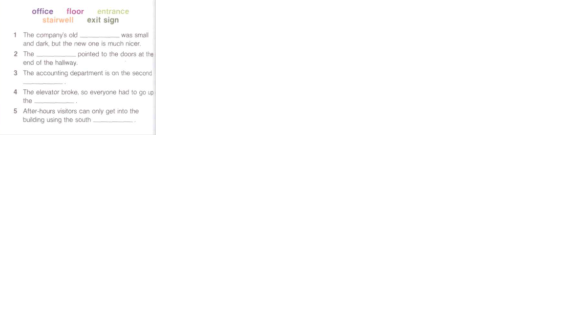 1) office - Старый офис компании был маленький и темный, новый гораздо лучше.