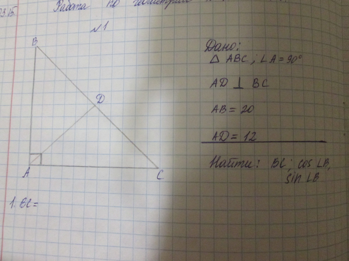 sinB=AD/AB=12/20=3/5 (из треуг АВД)