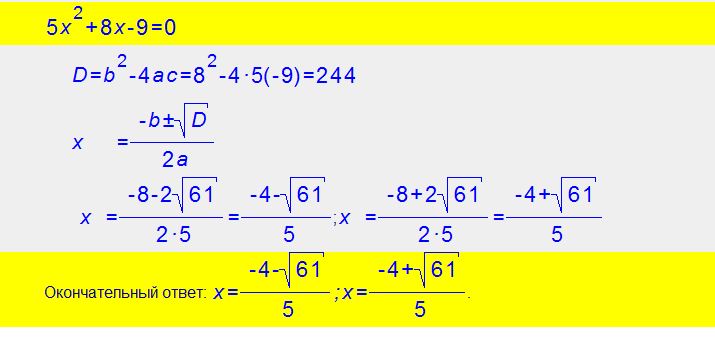 помогите решить уравнение через D И х1 х2 5хв квадрате + 8х - 9 =0 ответ -4±корень 61