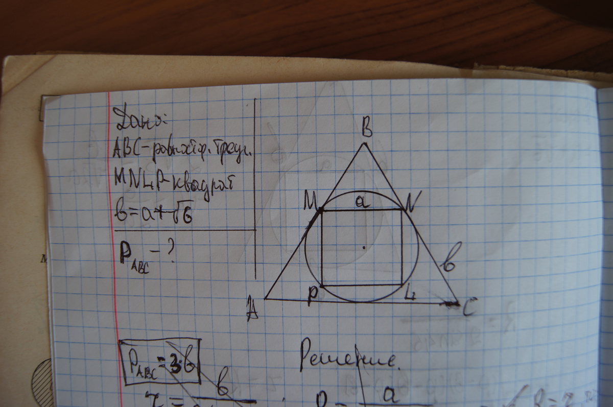 Сторона описанного около окружности правильного треугольника на корень из 6 больше стороны правильного четырехугольника, вписанного в ту же окружность, найдите периметр треугольника.