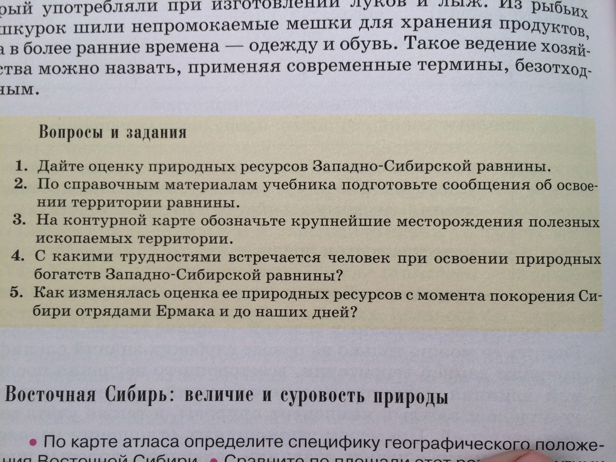 Западно-Сибирская равнина богатейшая природоресурсная территория России.Здесь издавна местные жители промышляли пушного зверя и дичь.Тундра-основной район разведения северного оленя.Тайга имеет ценную древесину хвойных пород, а в реках много рыбы. Лесная и лесостепная полоса располагают большими запасами плодородных земель.Большое богатство Западной Сибири — ее водные ресурсы, кроме поверхностных вод-рек и озер, - найдены огромные резервуары подземных вод. Но главное богатство Западной Сибири — это ее минеральные ресурсы. На территори сконцентрированы огромные запасы каменного и бурого угля, железных руд, крупные запасы торфа, богатейшие запасы солей.Здесь открыта уникальная нефтегазоносная провинция: 1 место в мире - по запасам газа и 2 место — по запасам нефти. Нефть и газ Западной Сибири имеют высокое качество.