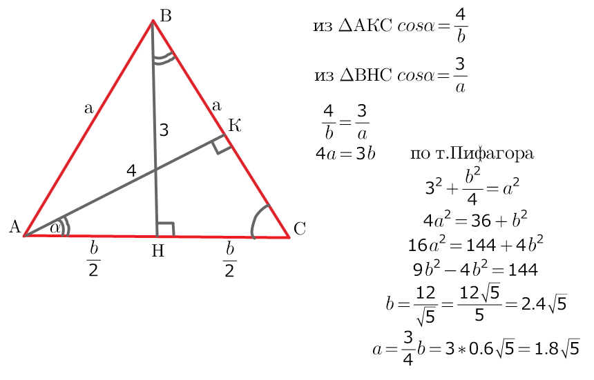 "В равнобедренном треугольнике высота, опущенная на основание равна 3 м, а высота, опущенная на боковую сторону, равна 4 м. Найдите стороны этого треугольника."
