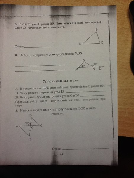 №5. 180-75=105; №6. 1) 180-130=50 (угол ONM), 2) 180-(40+50)=90 (угол MON); №7. 1) 180-80=100, 2) 180-100=80; №8. 1) 180-96=84 (угол DOC), 2) (180-84)/2=48 (углы ODC и OCD), 3) 180-96=84 (угол AOB), 4) (180-84)/2=48 (углы OAB и OBA).