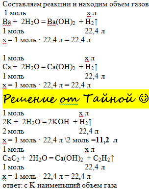 (Желательно с объяснением) укажите формулу вещества количеством 1 моль при взаимодействии которого с избытком воды выделится наименьший объем газа: Ba,K,Ca,CaC2
