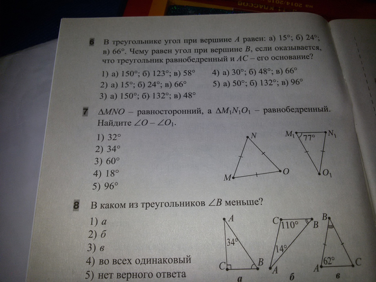 7. В равностороннем тр-ке все углы по 60 градусов (180:3), в равнобедренном <B = 180-2*77(углы при основании) =26. 60°-26°=34°