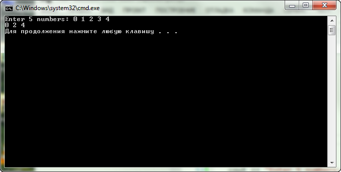 "Написать программу,которая вводит массив из N целых чисел и выводит на экран элементы с чётными индексами(индексация начинается с нуля). Протестировать программу на произвольных массивах размерностью 5 и 8 элементов."