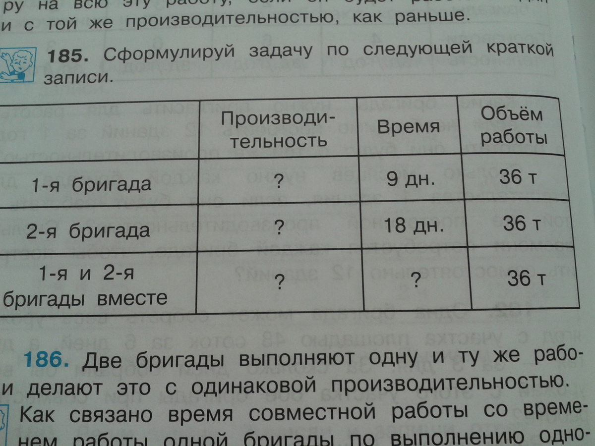 Найти производительность "1" и "2" бригады и их общее время и производительность если известно , что "1" бригада работает 8 часов , а "2" 18 и "1" бригада выполняет объем работы 36т , так же как и "2", а в сумме они выполнят объем равный 36 т.