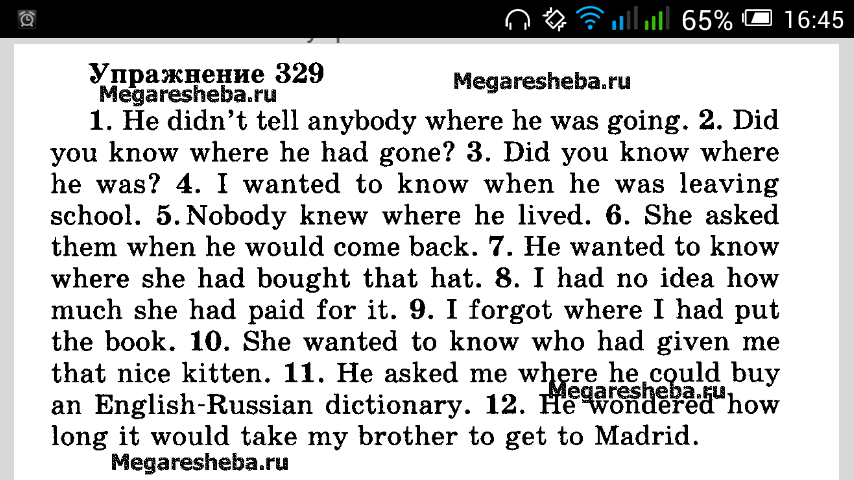 1. Он не говорил кому-нибудь где он ходил. 2. Ты знал где он ходил? 3. Ты знал где он был? 4. Я хотел бы знать когда он закончил школу. 5.Никто не знал где он жил. 6. Она спросила их когда он вернётся.7. Он хотел ыб знать где она покупала эту шляпу. 8. У меня не было идей сколько она заплатила за это. 9. Я забыл где я положил книгу. 10. Она хотела бы знать кто дал мне этого красивого котёнка. 11. Он спросил у меня где я покупал англо-русский словарь. 12. Он поинтересовался как долго мой брат пробудет в Мадриде.