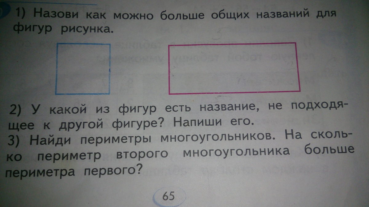 оба четырех угольные)у обоих есть периметр площадь....для того чтобы найти периметр измерь стороны и сложи их.....разное у них то что один квадрат а другой прямоугольник)