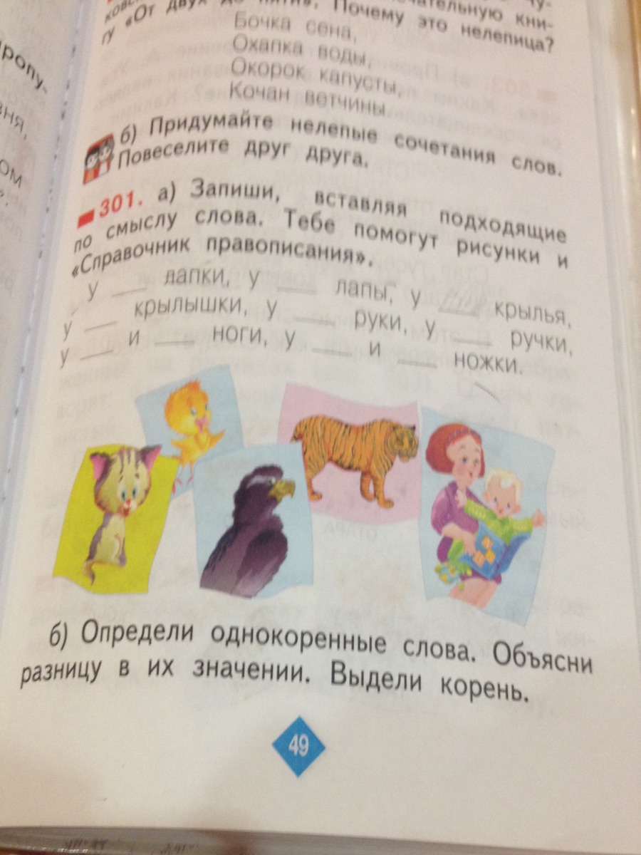 а) У котёнка лапки, у тигра лапы, у орла крылья, у цыплёнка крылышки, у мамы руки, у ребёнка ручки, у мамы и орла ноги, у ребёнка и цыплёнка ножки.