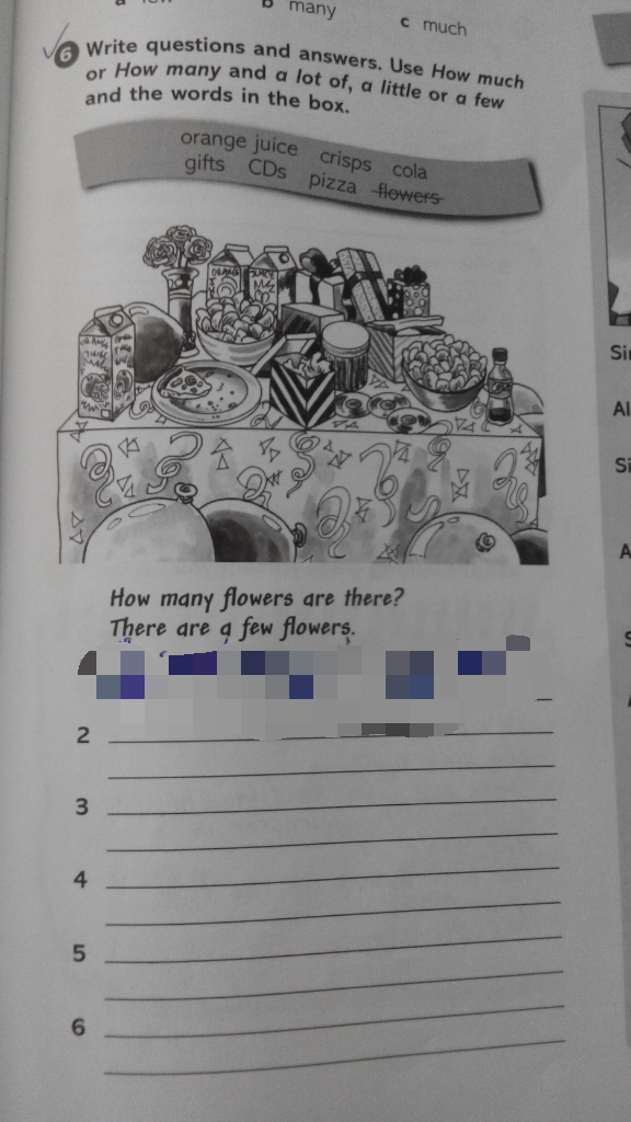 Questions:1.How much orange juice is there?2.How many crisps are there?3.How much cola is there?4.How many gifts are there?5.How many CDs are there?6.How many pizza are there?Answers:1.There are a few packet of orange juice there.2.There are a few plates of crisps there.3.There is a 1 bottle of cola there.4. There are a lot of gifts there.5.There are little of CDs there.6.There is a 1 pizza there.