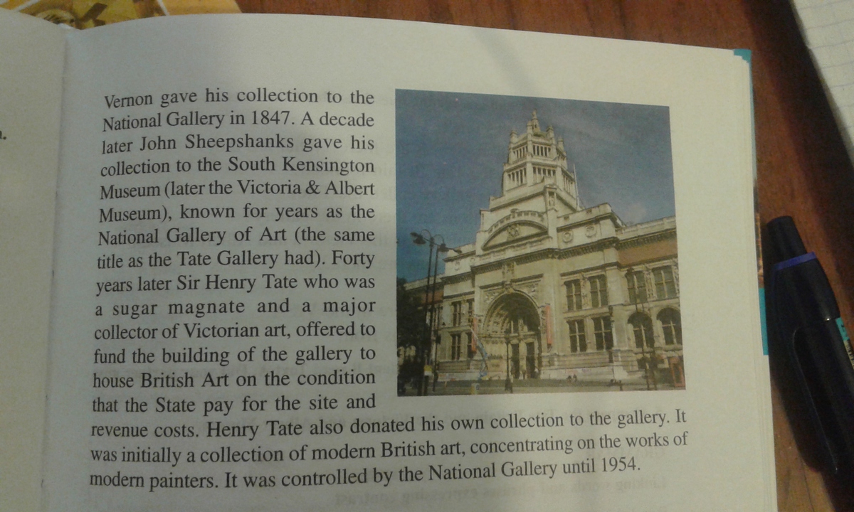 Вернон передал свою коллекцию Национальной галерее в 1847 году. Десятилетием позже Джон Шипшанкс передал свою коллекцию в музей Южного Кенсингтона (позднее назван музеем Виктории и Альберта), в течение долгого времени известный как Национальная галерея искусств. (аналогичное название имела Галерея Тейт). Сорок лет спустя, сэр Генри Тейт, который был сахарным магнатом и крупнейшим коллекционером произведений викторианского искусства, предложил проспонсировать строительство галереи британского искусства, при условии, что государство предоставит подходящее место и ежегодный грант. Генри Тейт также пожертвовал свою собственную личную коллекцию галерее. Изначально это была коллекция современного (на тот момент) британского искусства, основанная на работах современных (на тот момент) художников. Коллекция находилась в национальной галерее вплоть до 1954 г.
