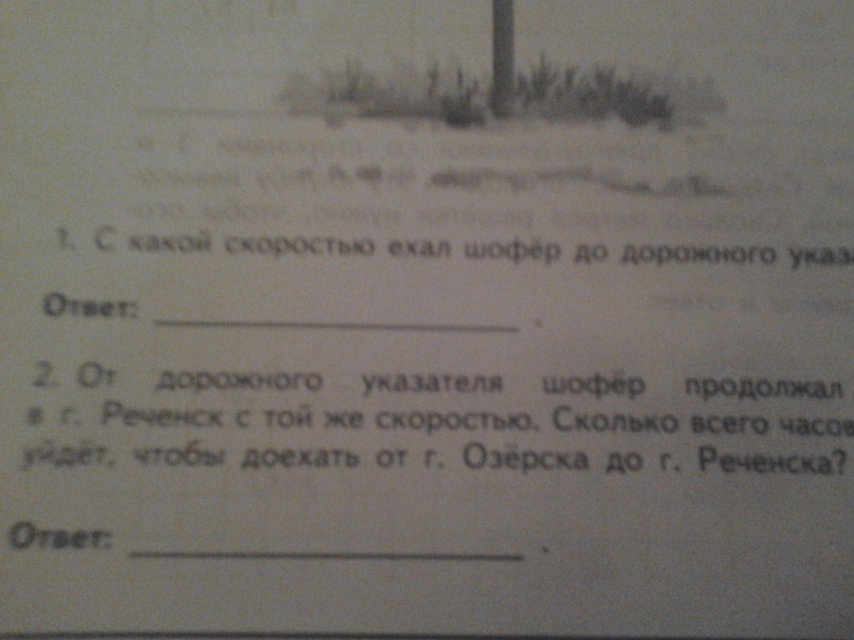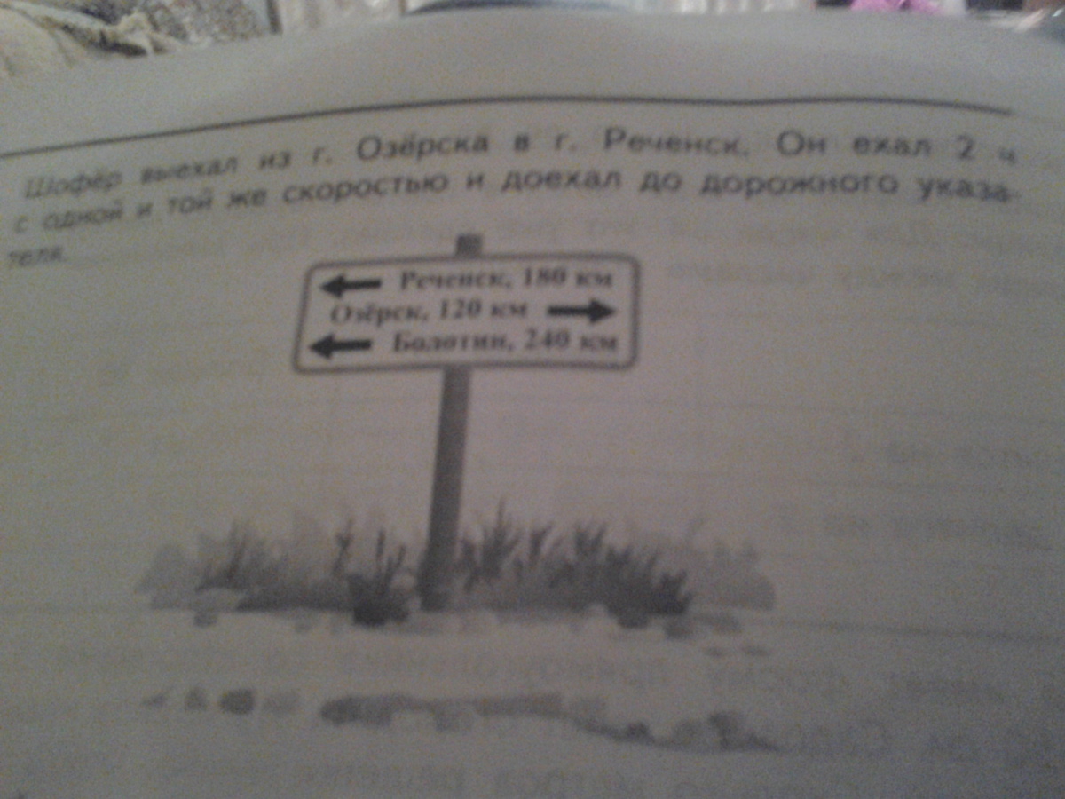 смотри чтобы найти скорость нужно путь поделить на время. на указателе написано ,что шофер отъехал от озерска 120 км и в условии написано,что он ехал два часа. значит если мы поделит 120 на 2 мы узнаем скорость. она получается 60 кмч