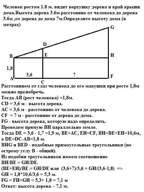 человек ростом 1.8 м. видит верхушку дерева и край крыши дома.Высота дерева 3.6м расстояние от человека до дерева 3.6м ,от дерева до дома 7м.Определите высоту дома (в метрах)