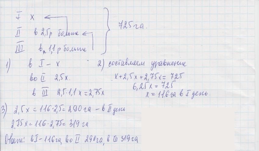 За три дня собран урожай с 725 га, причем во второй день убрали в 2,5 раза больше чем в первый, а в третий в 1 целую 1/10 раза больше, чем во второй. Сколько гектаров убрали в третий день? Со схемой пожалуйста)))
