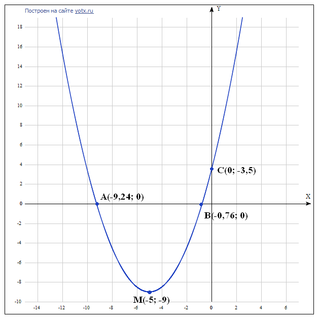 Пересечение с осью OX в точках A(-9,24; 0) и B(-0,76; 0). Пересечение с осью OY в точке C(0; 3,5).