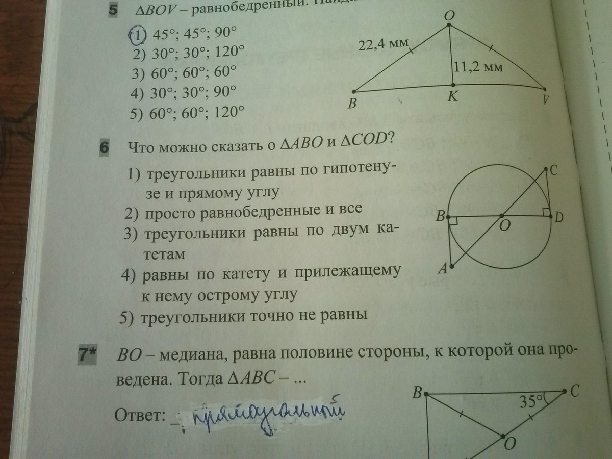 Треугольники АОВ и СОD прямоугольные. В этих треугольниках имеется по равному катету (радиусы ВO=DO) и прилежащему к нему острому углу при центре окружности (они вертикальные).