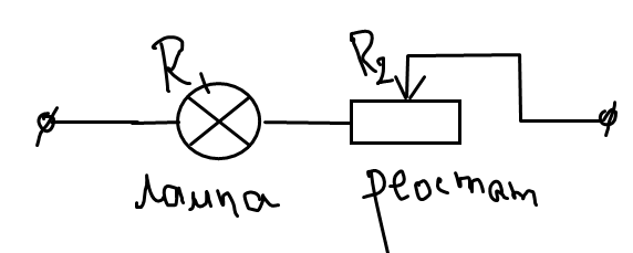 Т.к. лампа и реостат соединены последовательно, то полное сопротивление цепи будет равно R=R₁+R₂