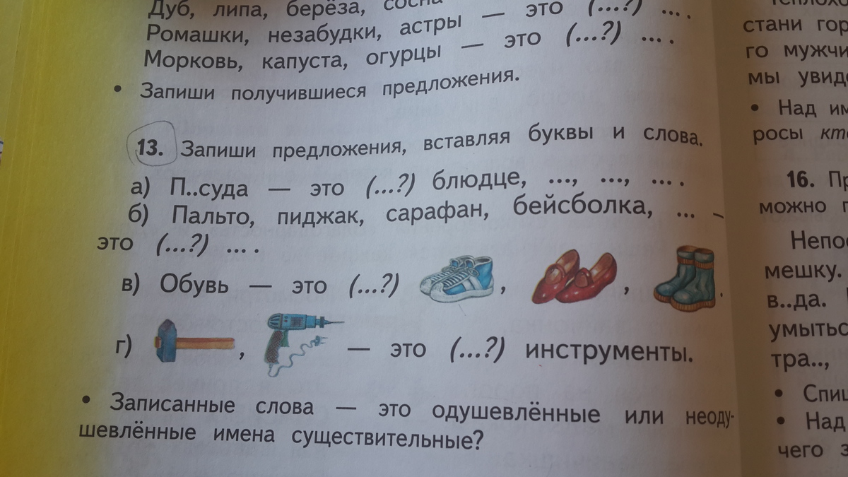а) Посуда-это блюдце, чашка, тарелка, кастрюля. б) Пальто, пиджак, сарафан, бейсболка - это одежда. в) Обувь-это кроссовки, туфли, сапоги. г) Молоток, дрель - это рабочие инструменты.
